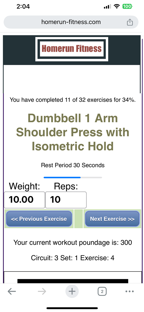 As you complete exercises with weights used, the Workout Poundage tracker will update with the total poundage (weight x reps) that you have moved so far in this workout. Immediately above the Exercise name is your Workout percentage completion.