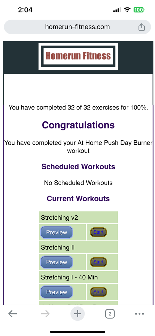 Once you have completed all your exercises in the workout, Your workout completion will show 100% and Congratulations will display on the screen.