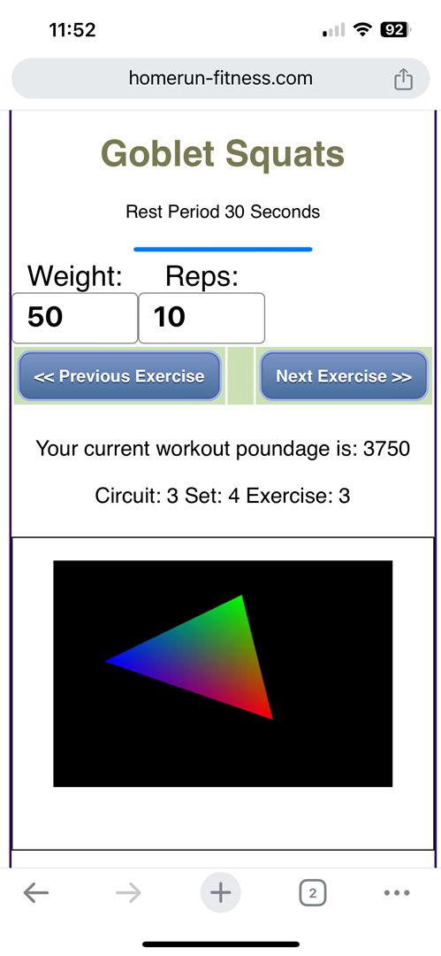 The Workout view will provide you with detailed exercise by exercise information including the name of the exercise, planned number of reps, time (duration) of the exercise (if applicable), planned weights (if applicable) and a countdown timer if this is a timed exercise. Note that when a timed exercise completes it will autoadvance to the next exercise. If the exercise is not set to Auto Advance then tap the Next Exercise >> button.