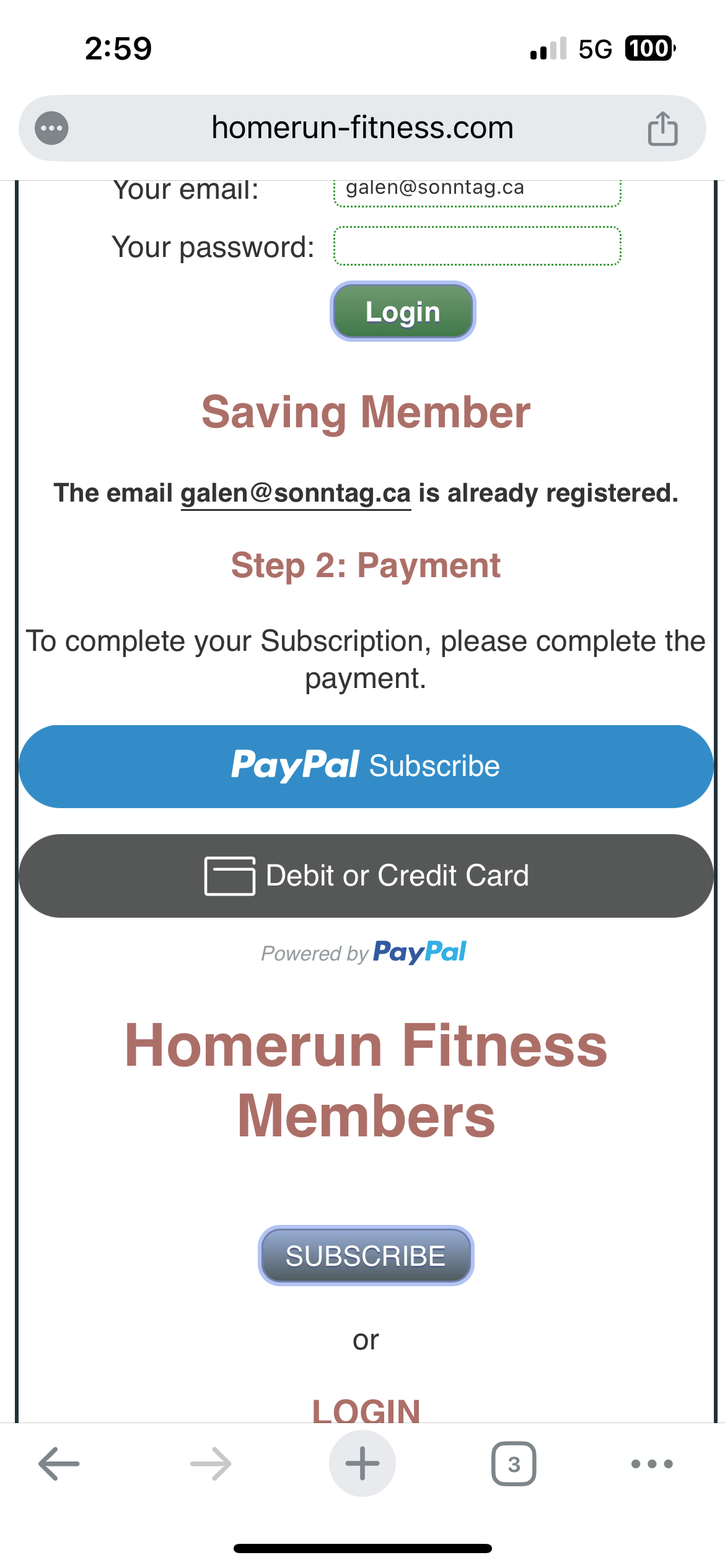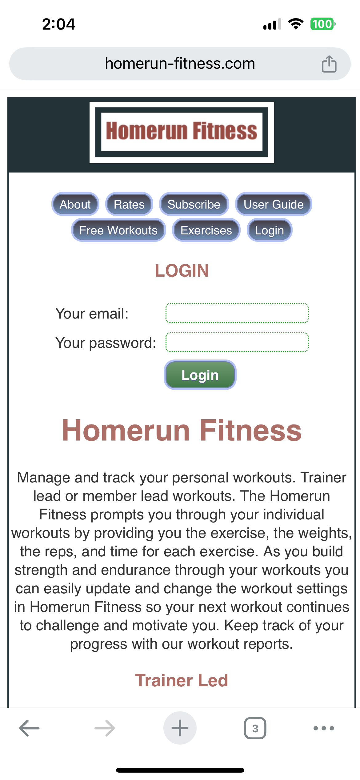 Once you have your membership account and subscription set up, you can login from the Homerun-Fitness homepage. Just enter the email address and password you provided when you set up your account.