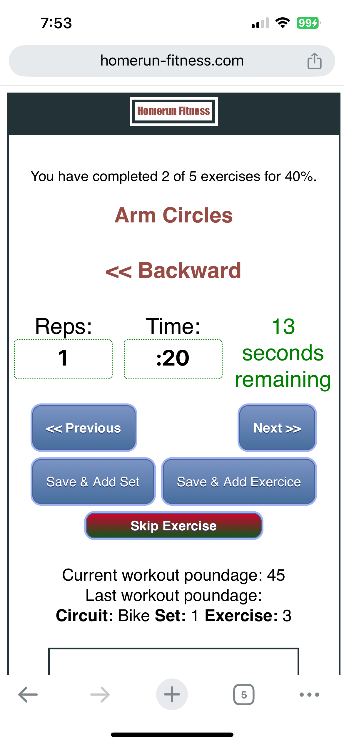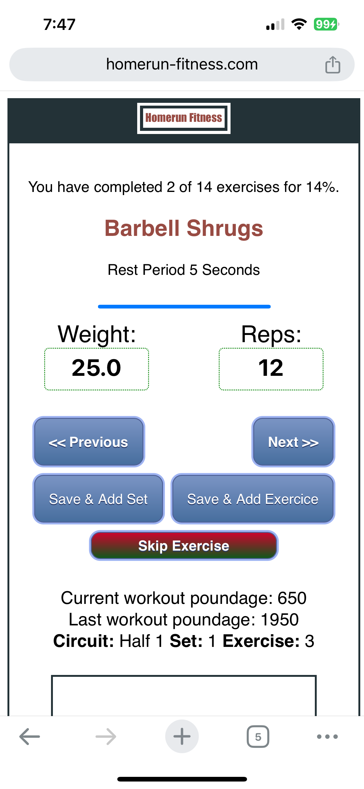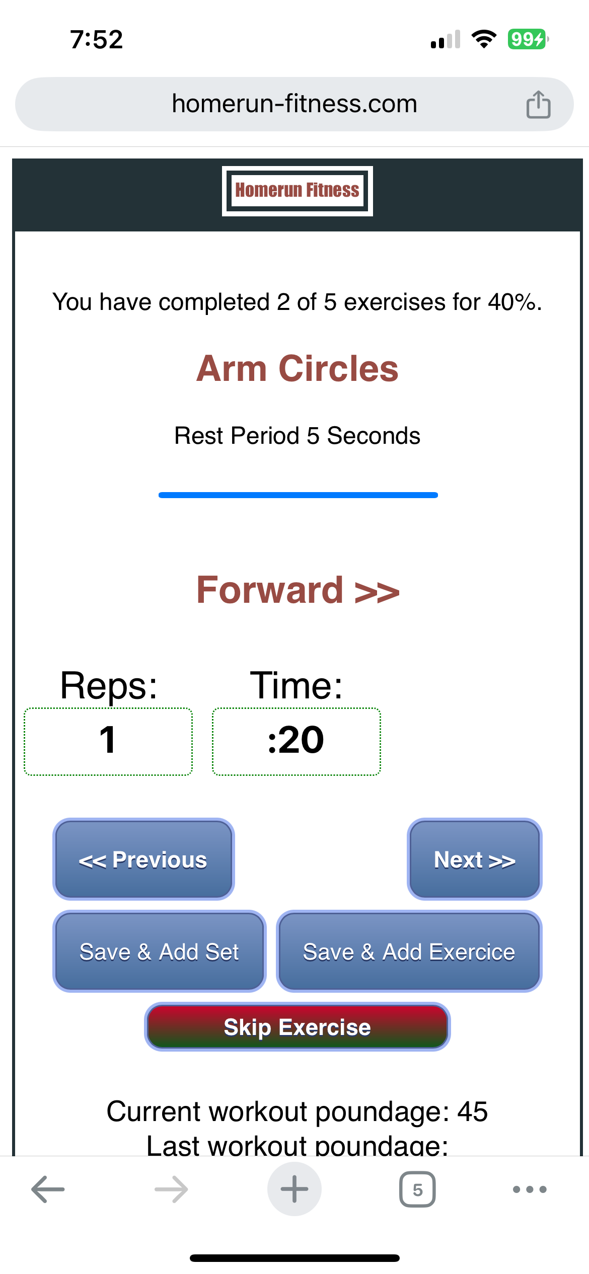 - Next Button - advances workout to the next exercise and saves the workout poundage.