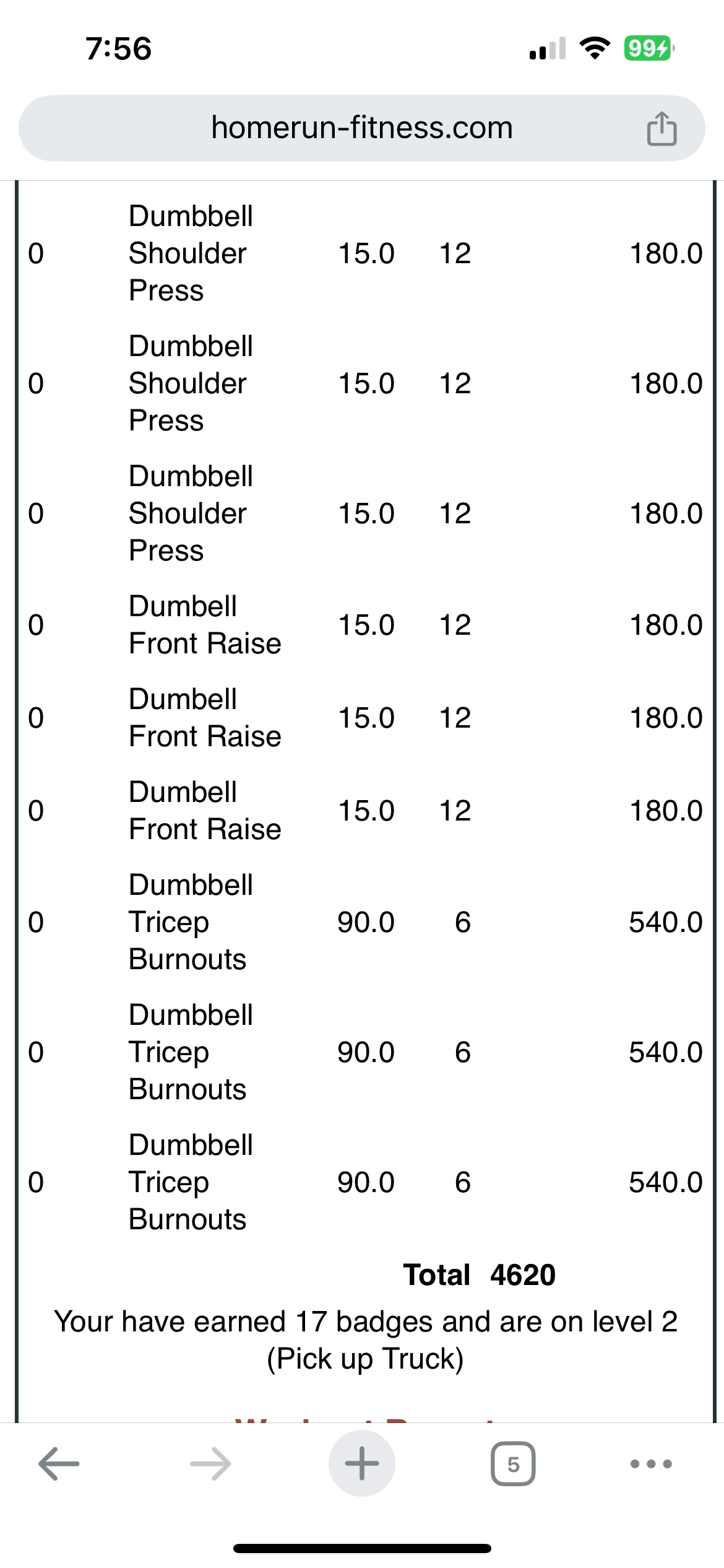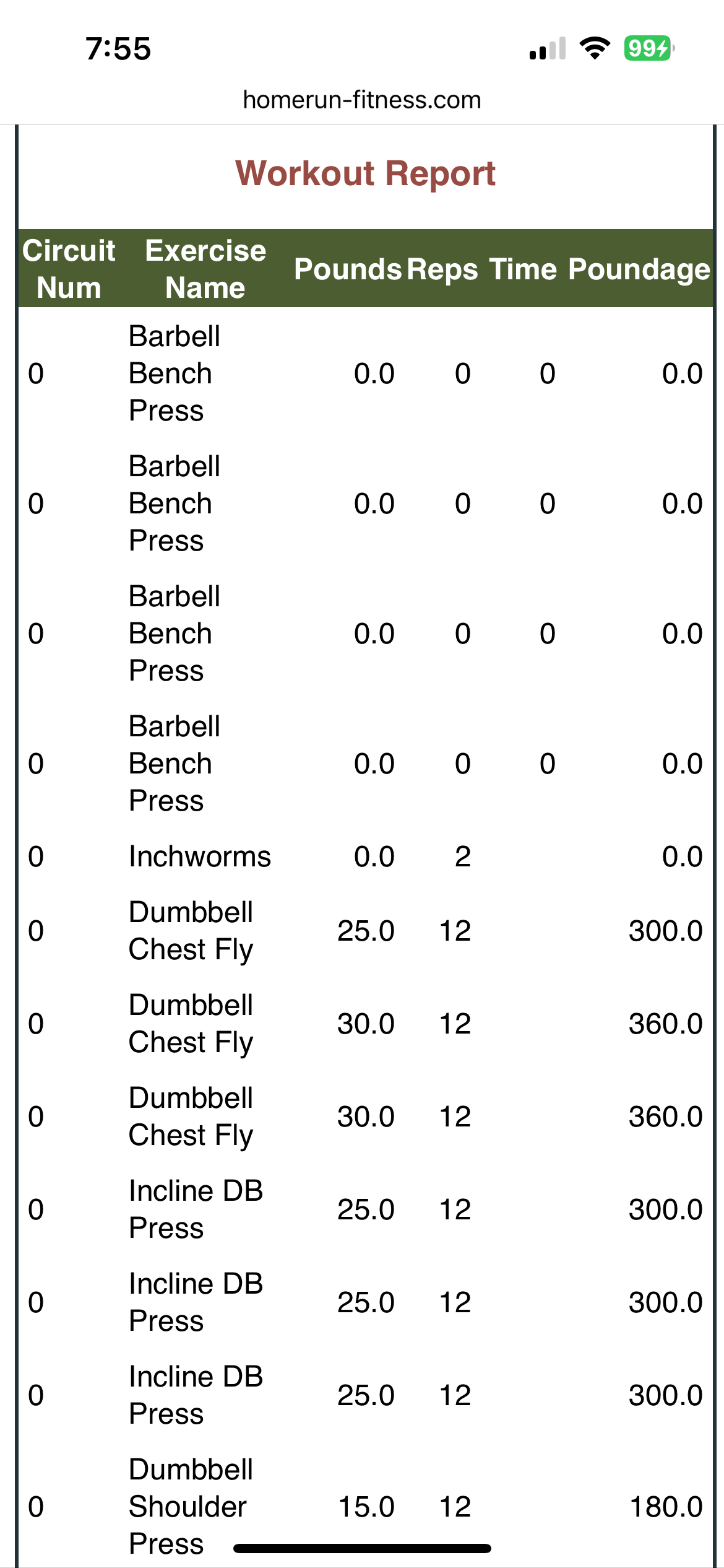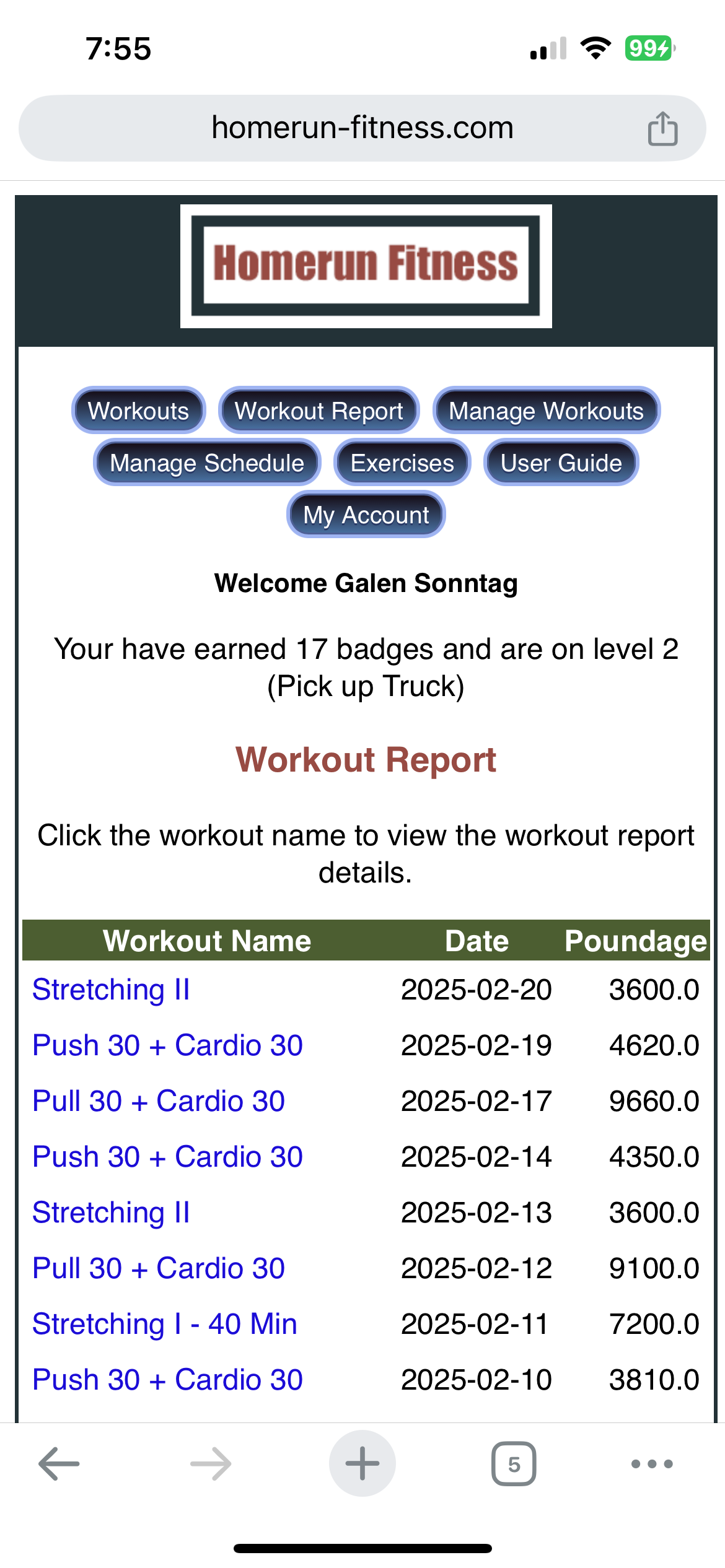 Tap Workout Report to a view a list of recently completed workouts, dates, and Workout Poundage.