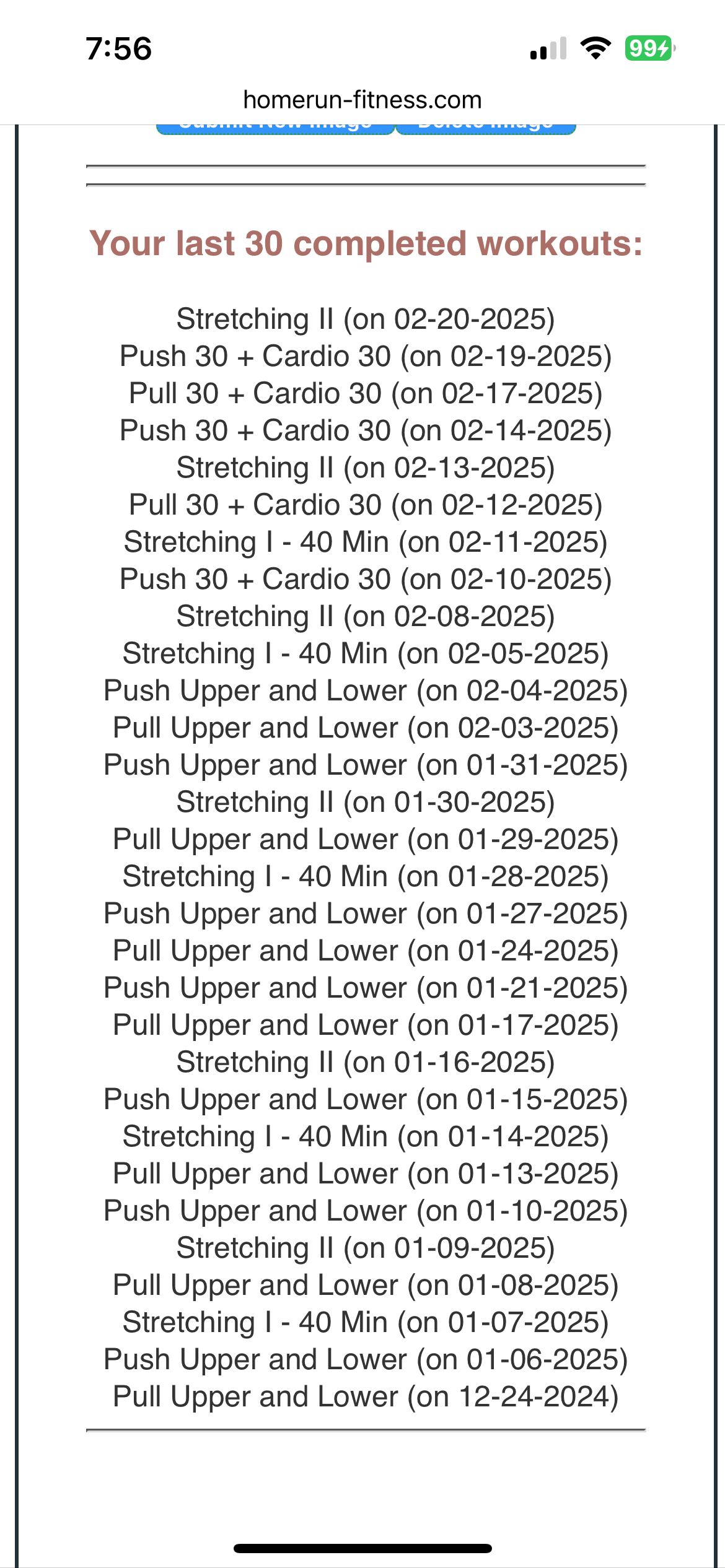 In Your Account, scroll down to view a list of workouts you have completed in the last 30 days