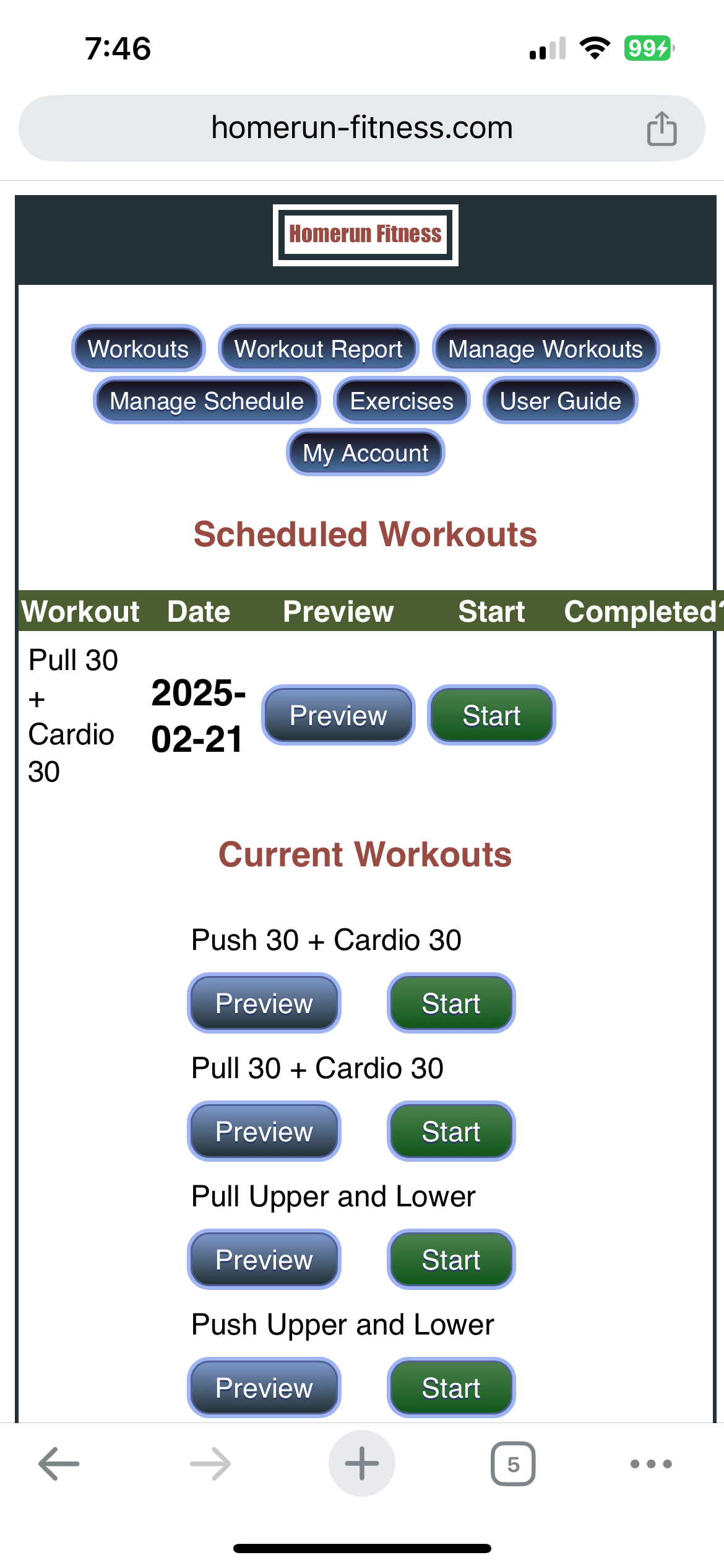 After logging in, you will have choices of Workouts, Workout Reports, My Account, User Guide, and Logout as well as from this screen you can Edit Profile and Change Password.
